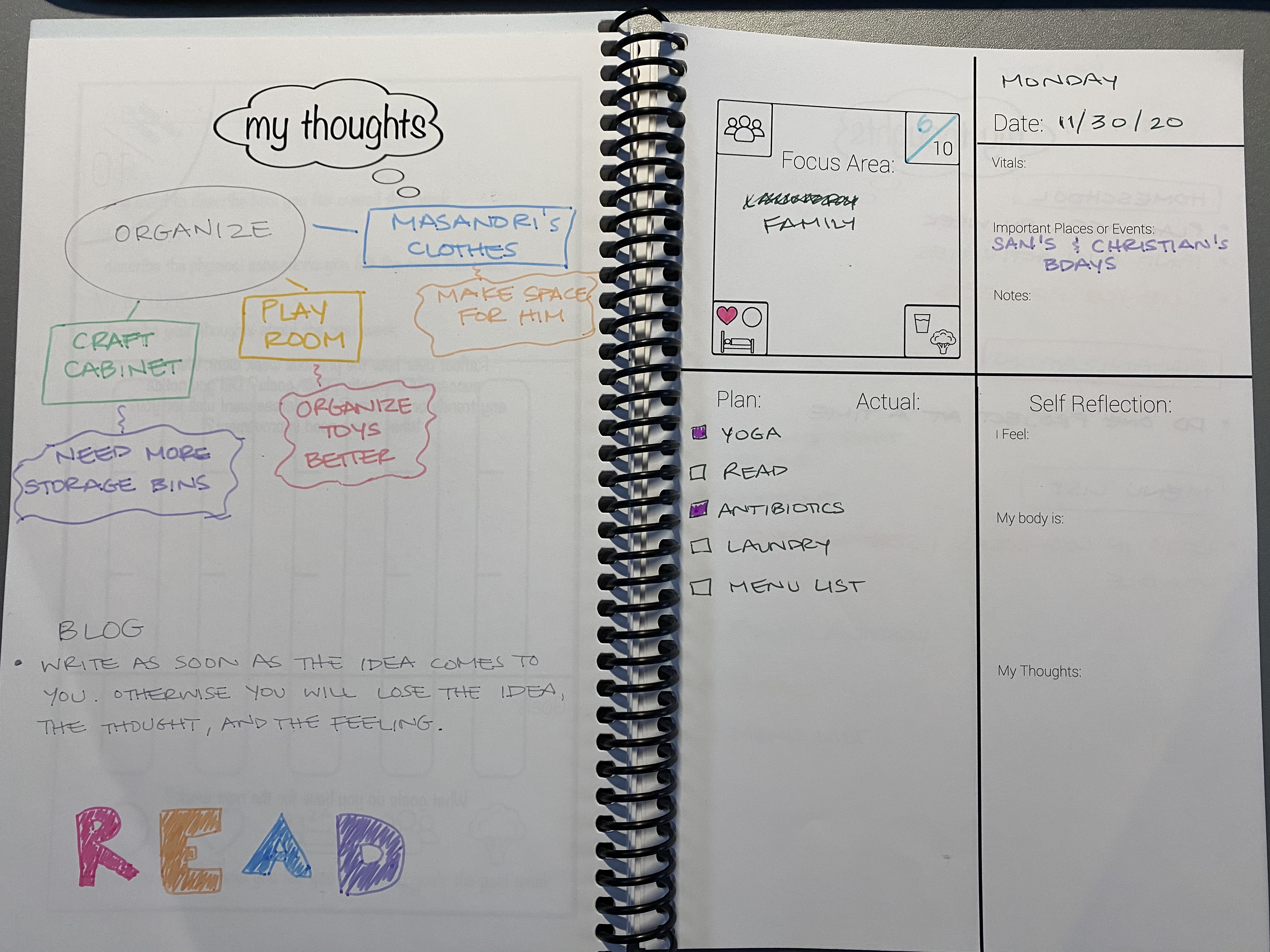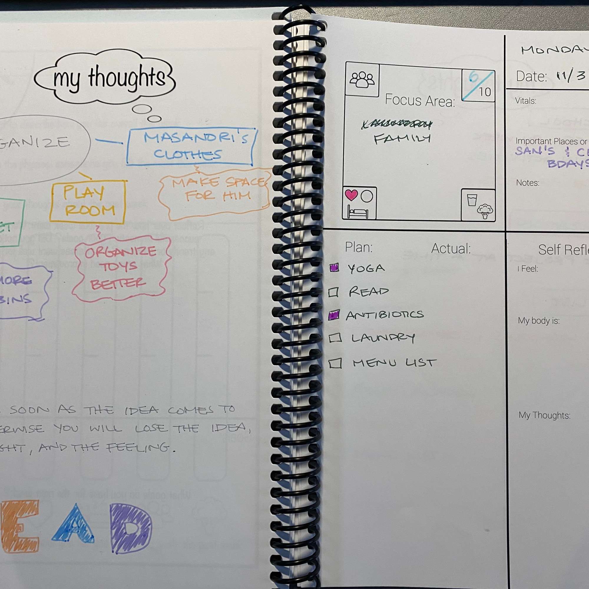 By taking moments at either end of your day, coloring in and jotting down notes, you will focus your mind, accomplish your daily intentions and goals, and then reflect and plan ahead. (See some samples shared below.)